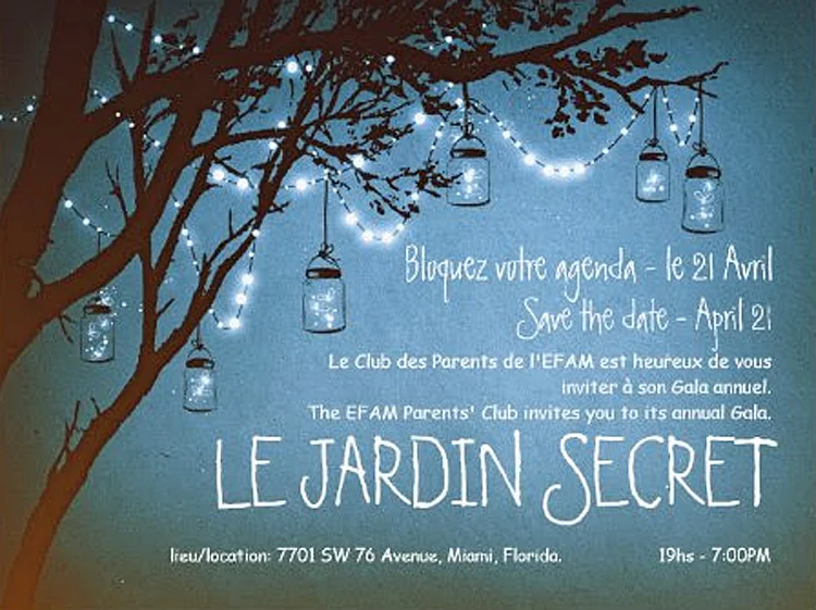 Le Club des Parents de l’EFAM est heureux d'annoncer le Gala: Le Jardin Secret. L'événement aura lieu le samedi 21 avril 2018 au 7701 SW 76th Avenue, Miami, Floride 33143. Le Gala promet d'être une soirée riche en musique, danse et comptera aussi avec une vente aux enchères.