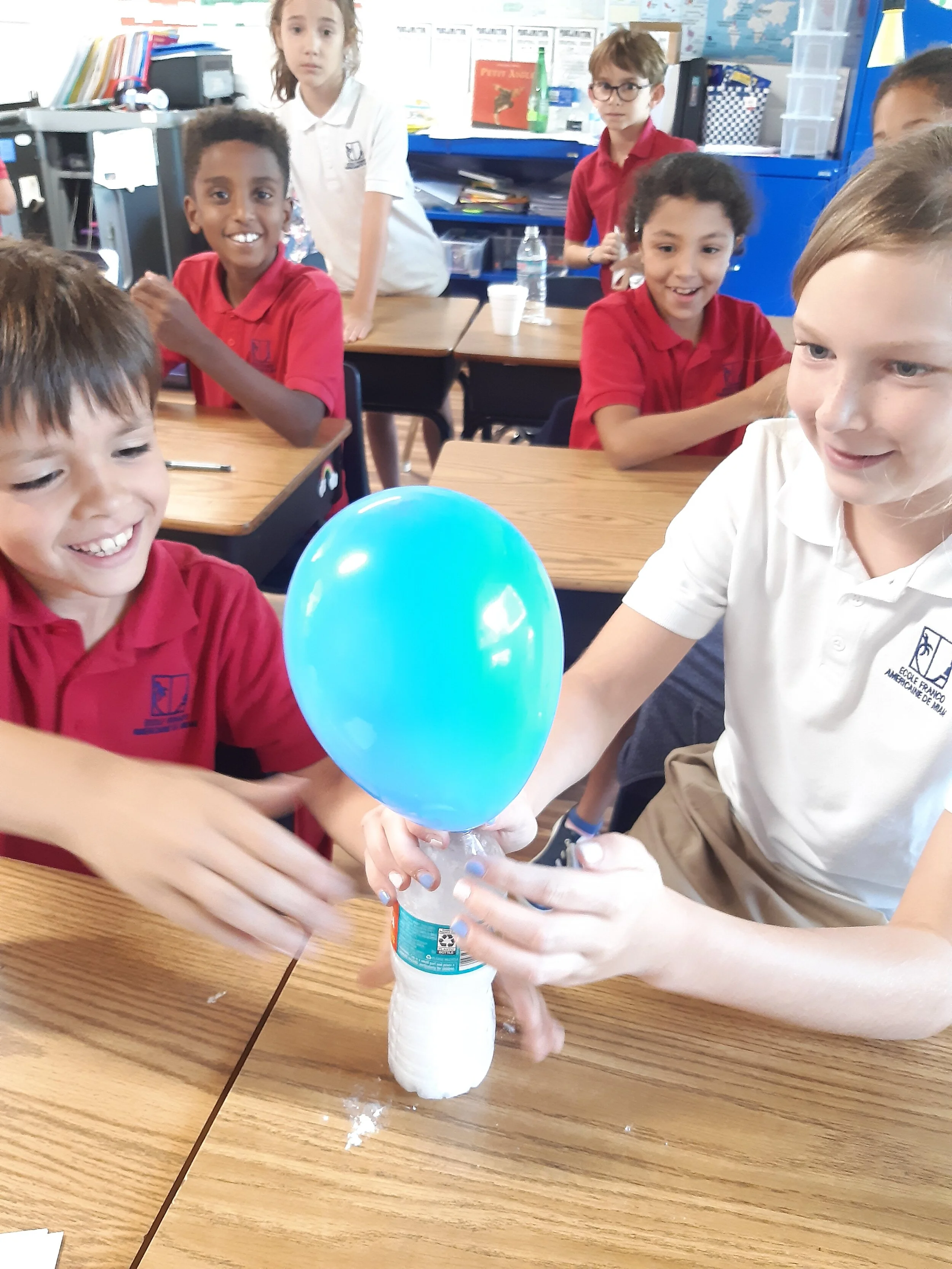 They wondered how to inflate a balloon without blowing air. Students questioned themselves, made hypotheses, thought about the material, drew a diagram, set up the experiment, concluded and interpreted the results like scientists!